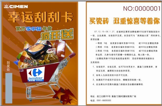 我公司坚持以“做您认可的促销服务商,您的认可就是我们的服务标准”为宗旨。拥有精湛的技术,专业的生产设备,优质的销售服务,诚信的产品价格,我们始终坚持以人为本,不断创新,为广大用户提供优质的产品。 石家庄专业制作奖卡厂家——石家庄大斌商贸有限公司,专业承接各种奖券制作,奖卡促销已广泛应用于各行各业,特别是家庭日用消费品和零售商业。奖券促销的最大优势在于既能扩大销量,又不会损害企业的品牌形象,而且其特有的博彩功能会更深的激发消费者的参与热情 |